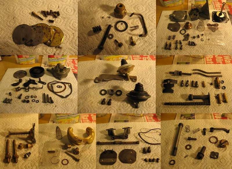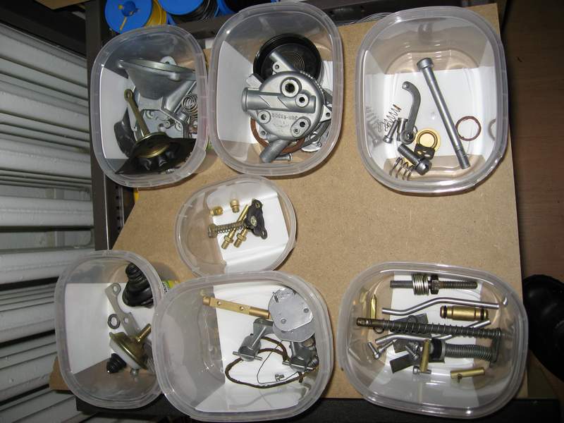 Nachdem ich erstmal die ausführliche Anleitung (30 Seiten!) durchgeackert hatte, habe ich den Vergaser komplett zerlegt. Die Schrauben habe ich nach Abschnitten sortiert, fotografiert und in Schächtelchen getan. Das hilft ungemein beim Zusammenbau! Aufpassen auf diese winzigen Kügelchen! Und gleich mal checken ob die Drosselklappenwellen nicht vielleicht ausgeschlagen sind. Hätte ja garnicht gedacht das ein Vergaser so viele Teile haben kann...
