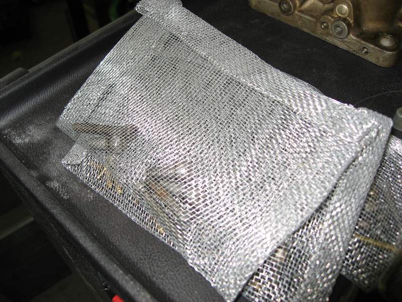 Damit man die kleinen Schräubchen und Beilegscheibchen überhaupt vernünftig Strahlen kann, habe ich 'was gebastelt. Man kann nämlich mit diesen dicken Gummihandschuhen der Strahlkabinen kaum etwas greifen. Kleine wiederverschließbare Säcke aus Fliegengitter, in die ich die Kleinteile einfülle, sind groß genug um gegriffen werden zu können. Gestrahlt wird halt durchs Gitter durch. Funzt prima! Teile mit loch werden einfach auf einen Draht aufgefädelt und der dann zum Ring vertüddelt. Funzt auch supi!