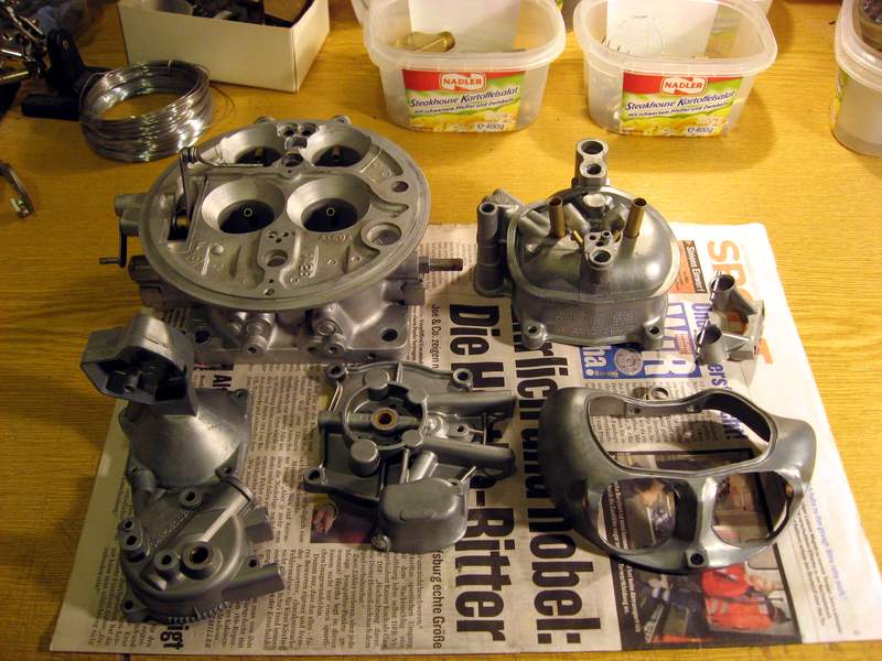 Sandstrahlen: Als "Sand" habe ich Glasperlen verwendet. Was für 'ne Sauerei! Aber das Ergebnis ist prima! Die "Murmeln" haben nur 0,002 mm im Durchmesser, sind also fein wie Staub! Wichtig: Sämtliche Lager abdecken, damit die nicht mitgestrahlt werden. Sie würden zu rauh und evt. geweitet. Das betrifft auch feste Düsen (wie z.b. beim Solex 28 PCI) und winzigste Kanälchen. Die Glasperlen sind so klein, die rutschen zwischen Lager und Drosselklappenwelle! (Diese also unbedingt ausbauen!!) Und dann sind eben diese schwergängig und die Glasperlen arbeiten sich bei Bewegung ins Material ein. Nochmal: Alles Wichtige zustöpseln und nach dem Strahlen peinlichst genau reinigen! Die Oberfläche wird durch die Glasperlen leicht verdichtet und bekommt ein seidenmattes Finish. Ich steh da voll drauf. Unversiegelt wird das mit der Zeit allerdings wieder dreckig... Wichtig bei Glasperlstrahlen: Nicht zu viel Luftdruck. Ab 6 Bar zerplatzen die microkleinen Perlchen zu atomfeinem Staub - und die Sauerei wird noch mehr...