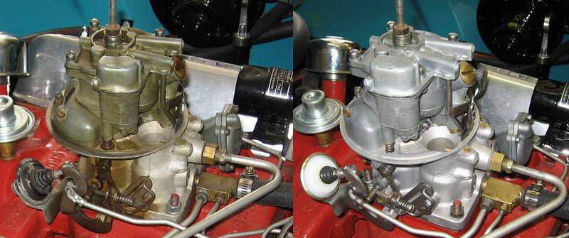 So, jetzt wird montiert! Ach macht das Spass, wenn alles so schön bereitliegt und so schön sauber ist! Leider fehlen dem Repsatz neue Düsennadeln und der Filter. Und beim Vergleichen der Istwerte der Düsen und Ventile mit den Sollwerten stellt sich heraus, dass es die Amis bei der Restaurierung auch hier nicht so genau nahmen. Aber was solls. Hat ja vorher auch so gefunzt. Also alles einbauen und erstmal den Motor wieder ans laufen bekommen. Was fehlt oder nicht stimmt weis ich ja jetzt und kann in Ruhe auf die Suche gehen und die Teile später ergänzen oder tauschen. Der Vergaser ist ja schnell wieder ausgebaut. Das Zusammenbauen ist recht simpel. Einfach nach der Anleitung alles in umgekehrter Reihenfolge der Demontage montieren. Die Membrane soll man unter Vorspannung montieren und beim Schraubeneindrehen aufpassen, dass man die Membran nicht mit den Schrauben aufdreht. Und bei den Ventilen muss man achtgeben, dass man die richtige Dichtung aus dem Repsatz verbaut. Ob der Vergaser nach dem Zusammenbau noch funzt?