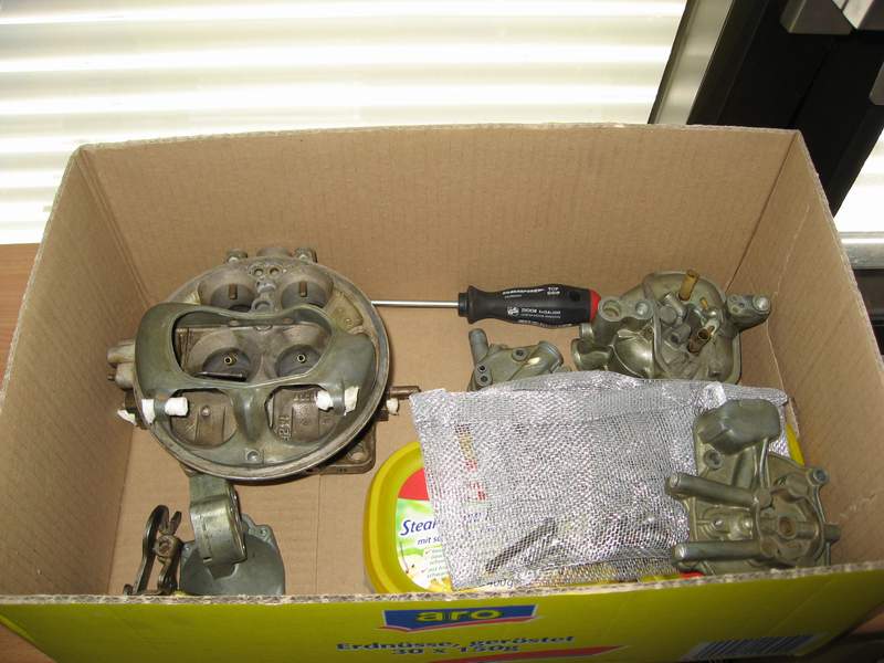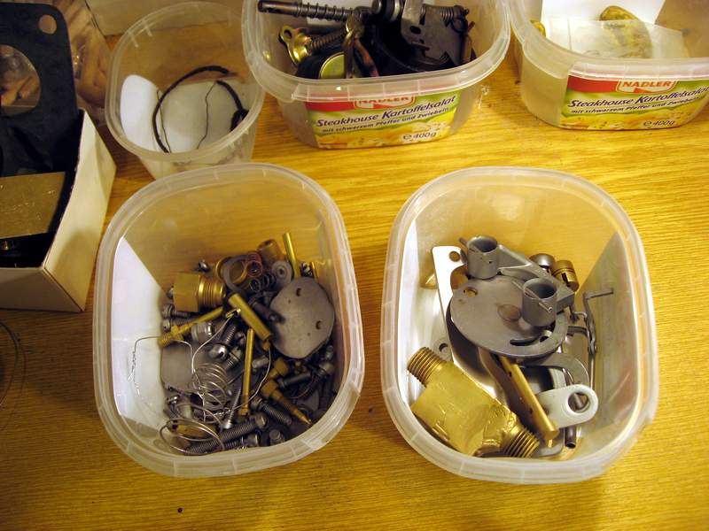 Nachdem ich erstmal die ausführliche Anleitung (30 Seiten!) durchgeackert hatte, habe ich den Vergaser komplett zerlegt. Die Schrauben habe ich nach Abschnitten sortiert, fotografiert und in Schächtelchen getan. Das hilft ungemein beim Zusammenbau! Aufpassen auf diese winzigen Kügelchen! Und gleich mal checken ob die Drosselklappenwellen nicht vielleicht ausgeschlagen sind. Hätte ja garnicht gedacht das ein Vergaser so viele Teile haben kann...